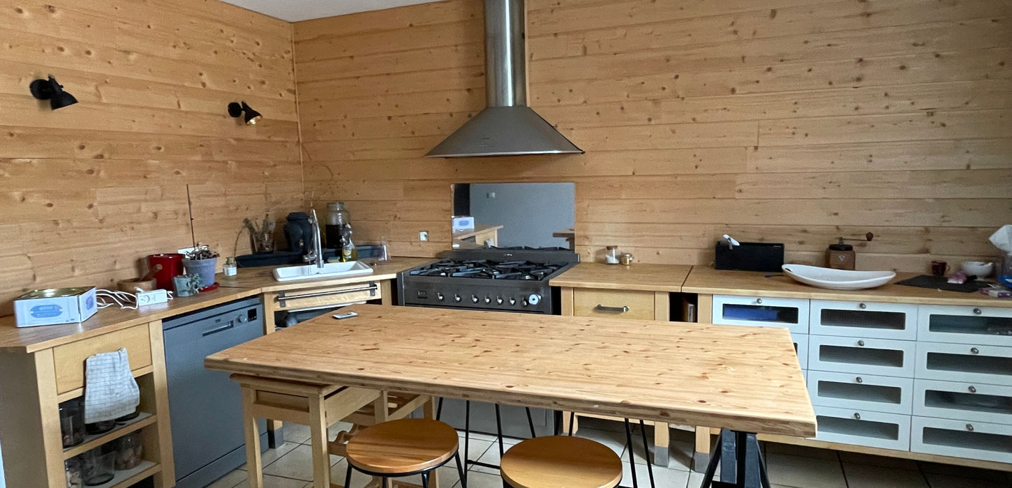Au rez-de-chaussée : une entrée desservant un salon-séjour de 22 m2 (avec poêle à bois), une cuisine aménagée, une arrière-cuisine, un wc.